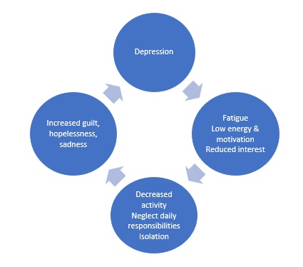 Here is what the cycle of depression might look like: symptoms arise such as fatigue, low energy and motivation, or reduced interest and enjoyment. These symptoms typically result in engaging in fewer activities or hobbies, neglecting responsibilities, or withdrawing from meaningful social groups. From this, an individual might miss out on the things that used to bring joy and pleasure, resulting in guilt for neglecting responsibilities, hobbies, and people. Their feelings of hopelessness, worthlessness, and sadness may worsen as they are hard on themselves and feel increasingly stuck. These feelings then feed back into depression, resulting in the same feelings of low energy that began the cycle.